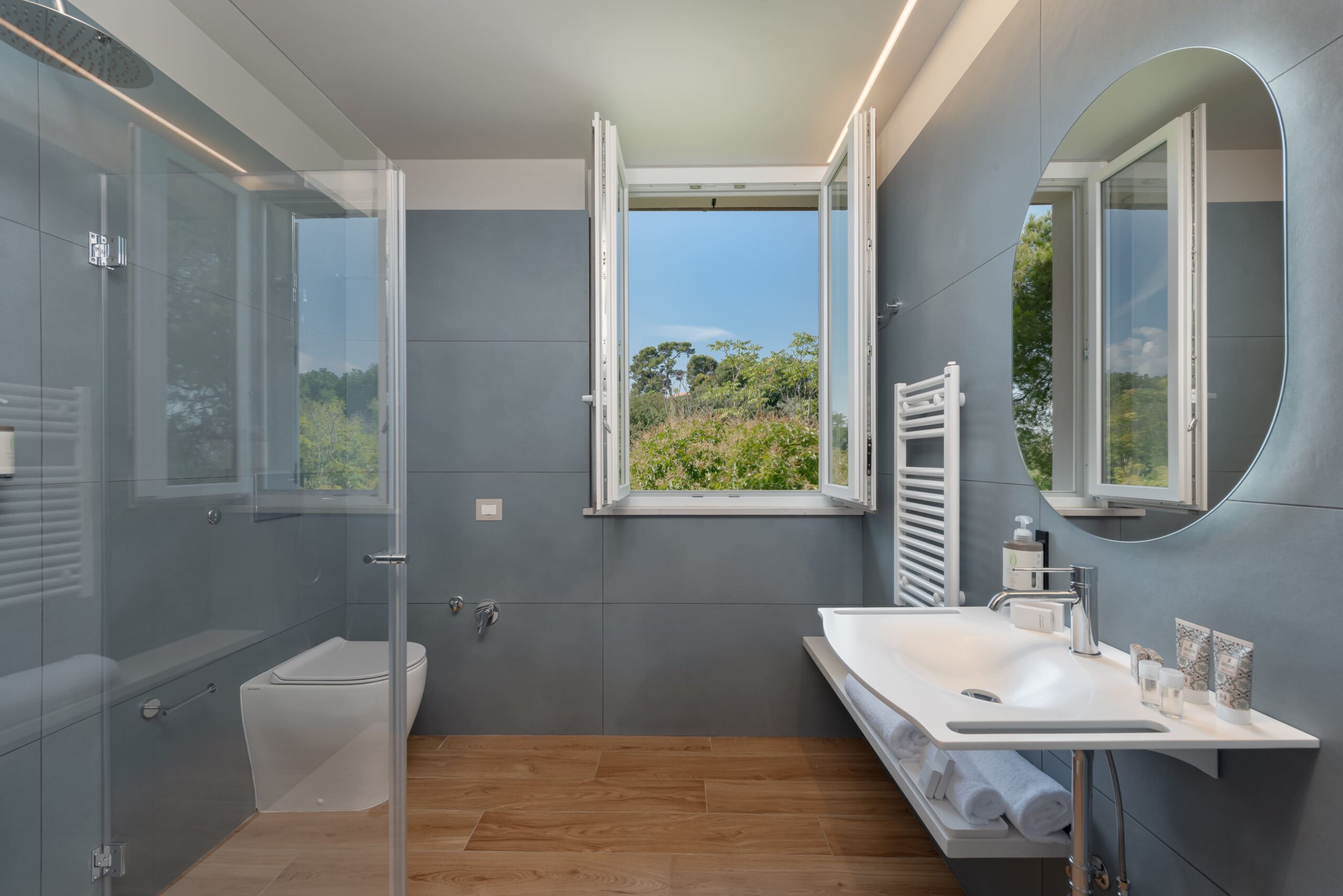 Il bagno privato, ampio e moderno, è rifinito in gres porcellanato e dotato di doccia double size in cristallo.