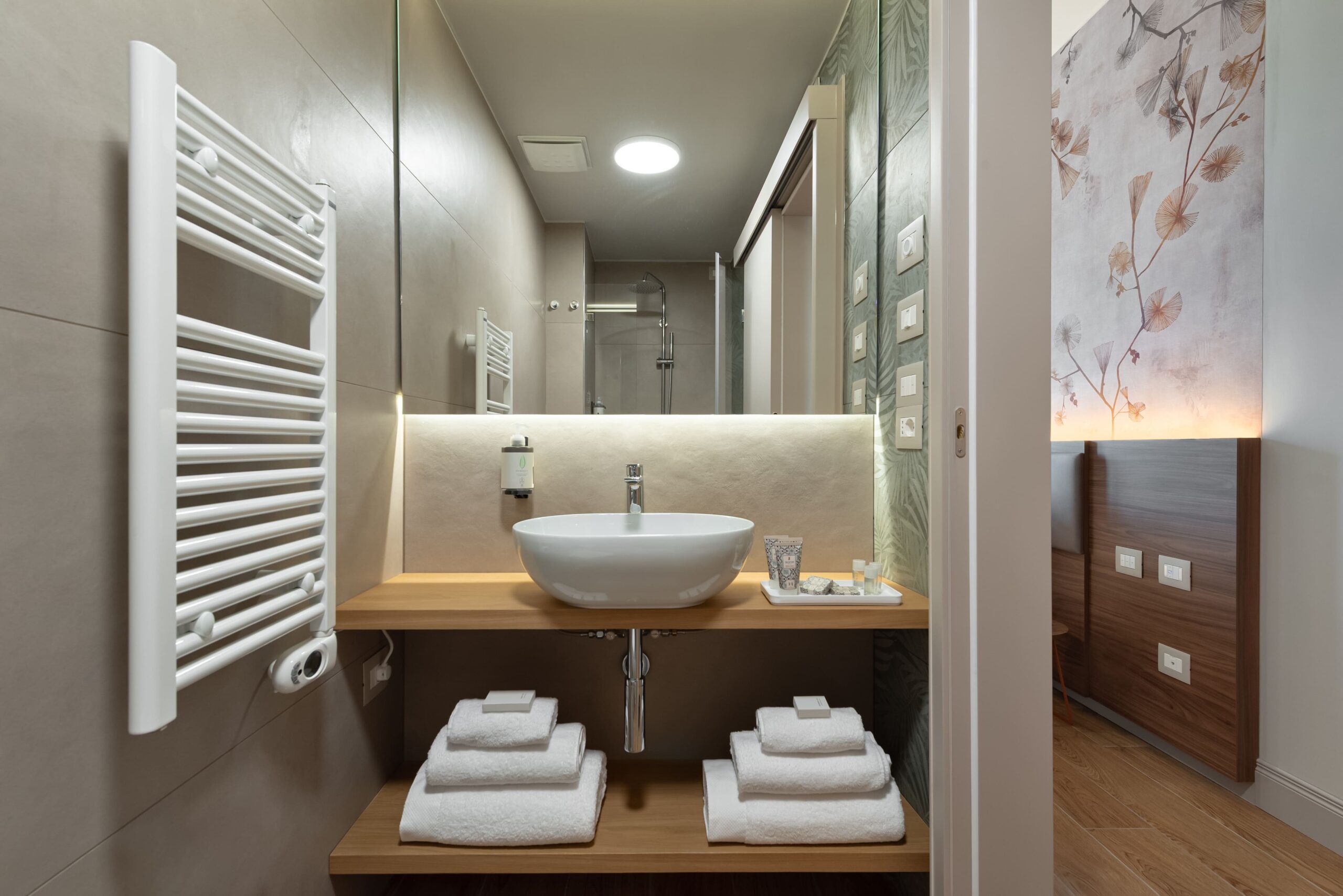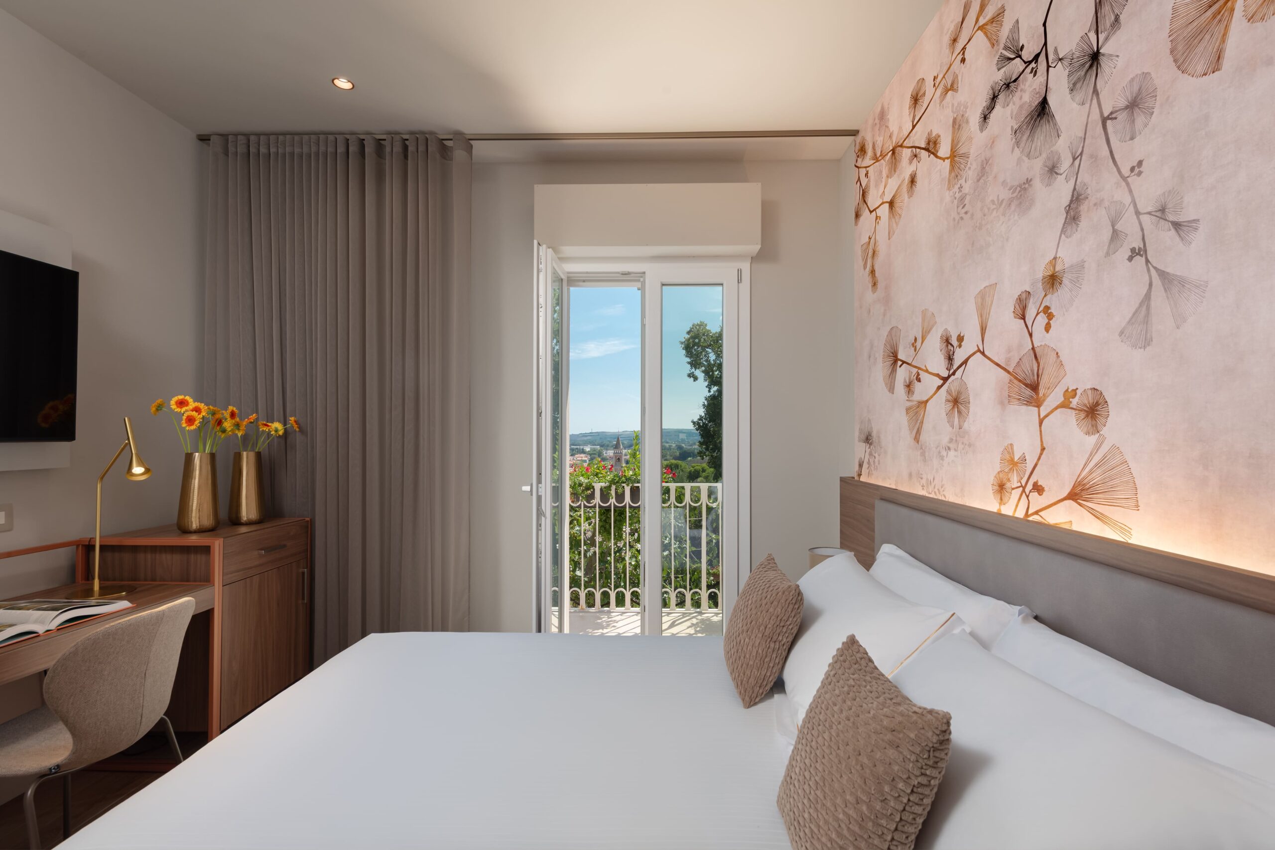 La stanza dispone inoltre di balcone, arredi su misura e di tutti i servizi pensati per il comfort durante il soggiorno: smart TV da 50”, Wi-Fi veloce, frigobar, cassaforte e armadio a vista.